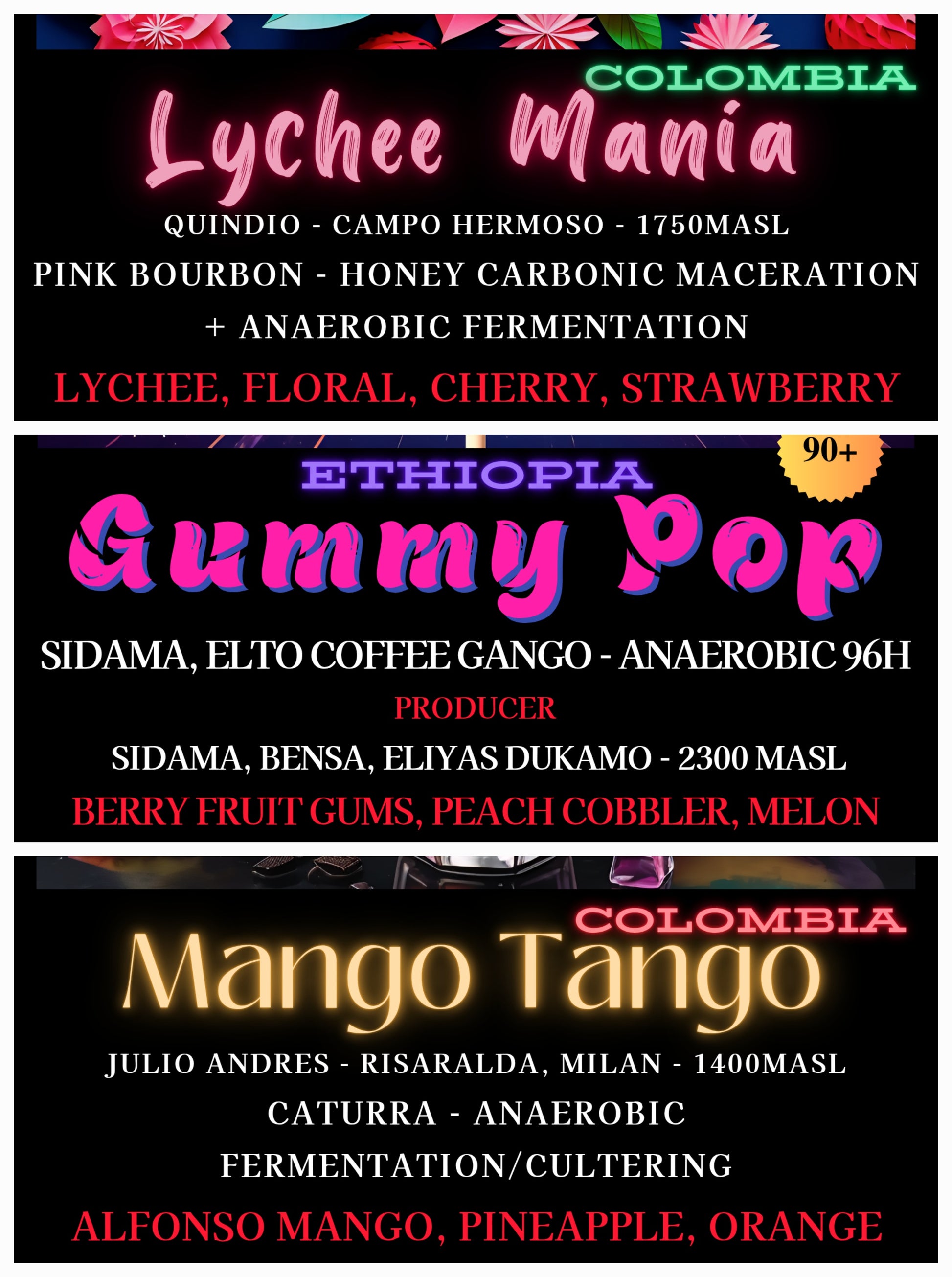 Enjoy 600 grams of top tear filter coffee, two (250g) of absolute fruit bombs, and a 100g of a (90+) scoring premium Ethiopian wonder.